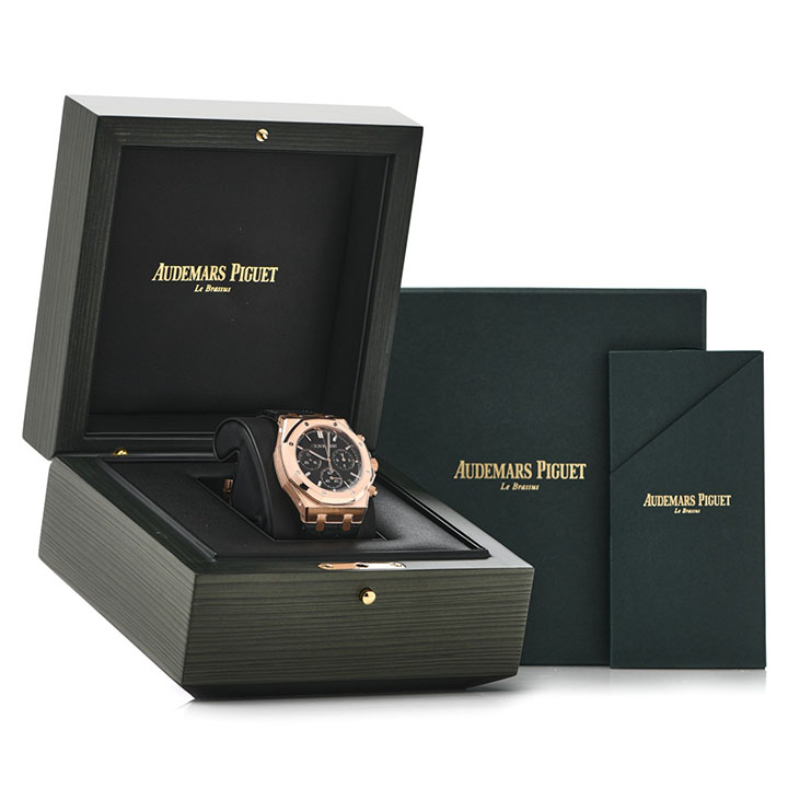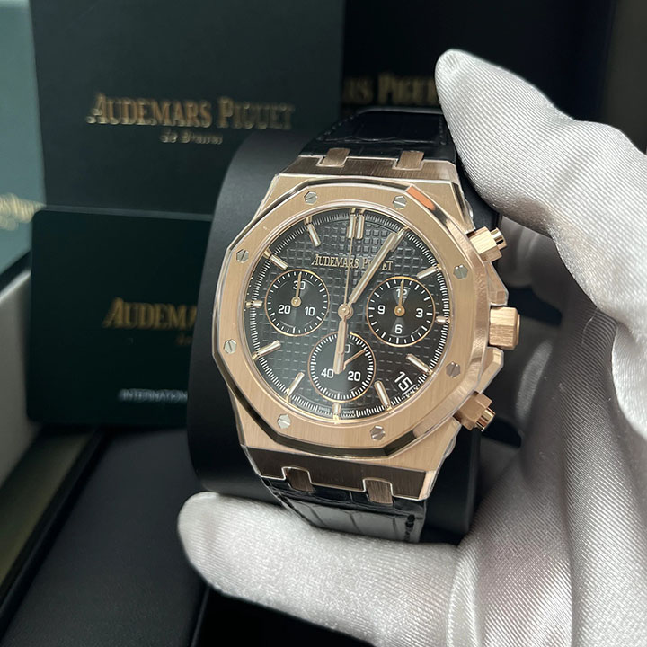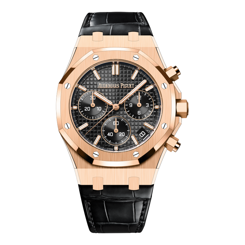 The 18-carat pink gold 41 mm case is enhanced by a black βGrande Tapisserieβ dial and a matching alligator strap. This Chronograph encompasses the new Royal Oak design evolution as well as the β50-yearsβ oscillating weight visible through the sapphire caseback.