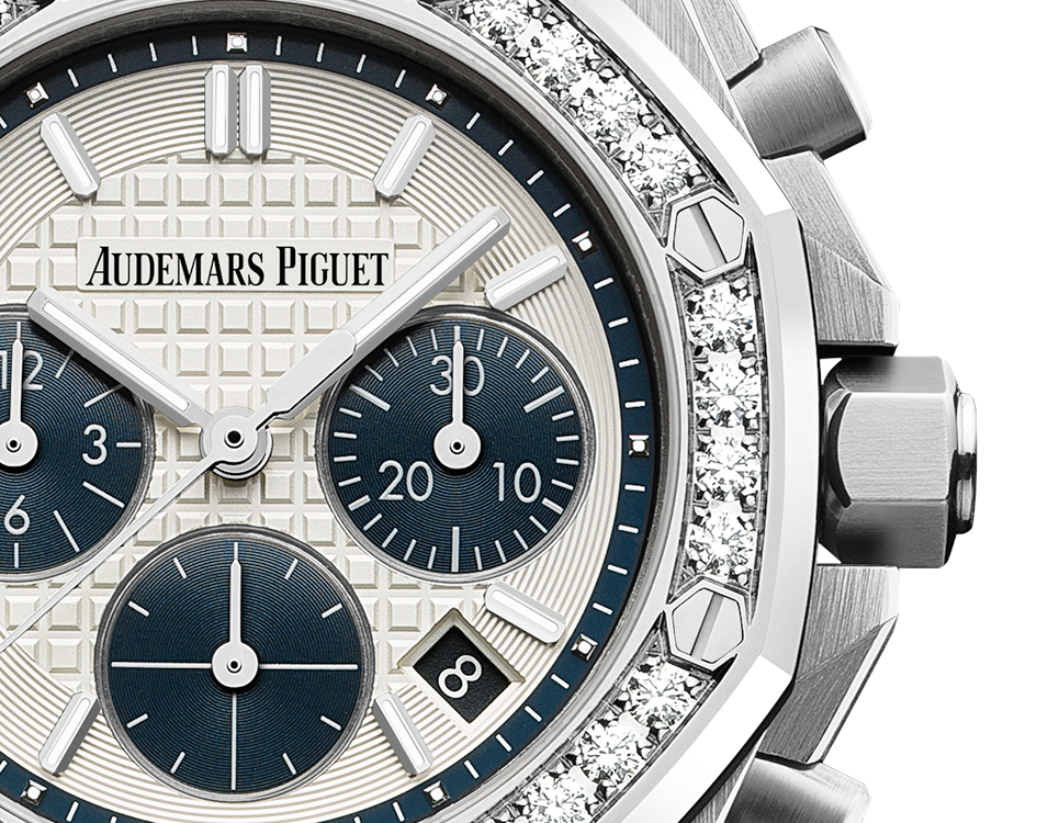 Silver dial with "Lady Tapisserie" engraving, blue subdial, blue outer dial,white gold luminescent applied hour-markers and Royal Oak hands.